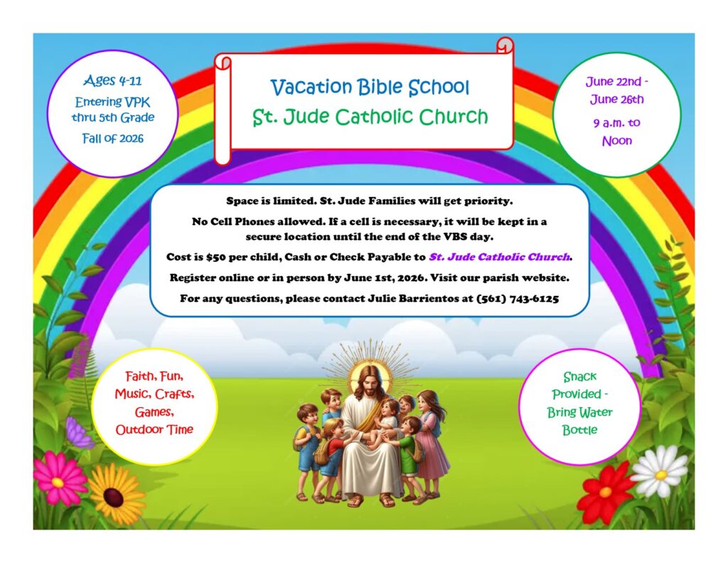 For any questions, please contact Julie Barrientos, Faith Formation Coordinator, at (561) 743-6125 or email at religioused@stjudechurch.net